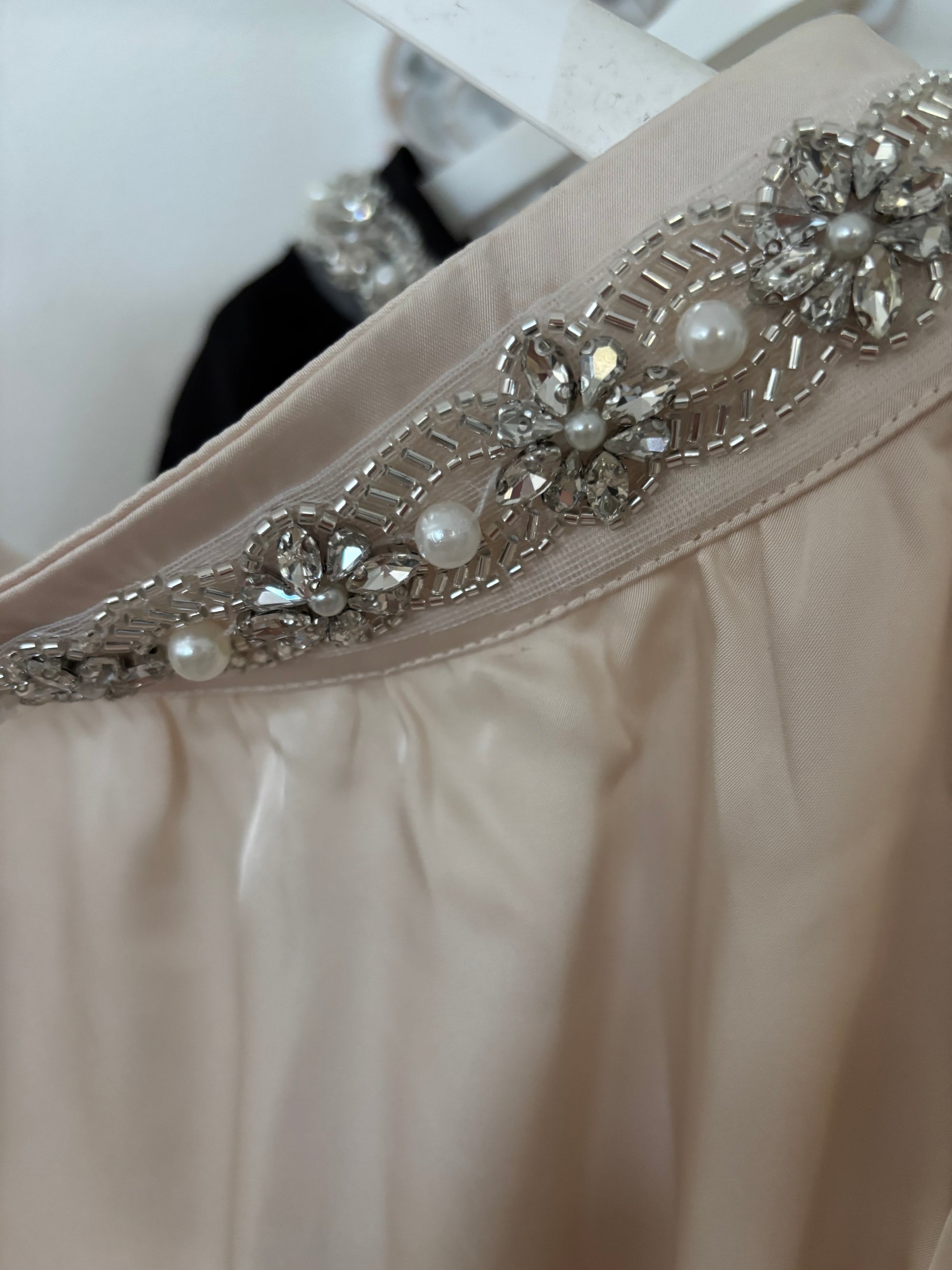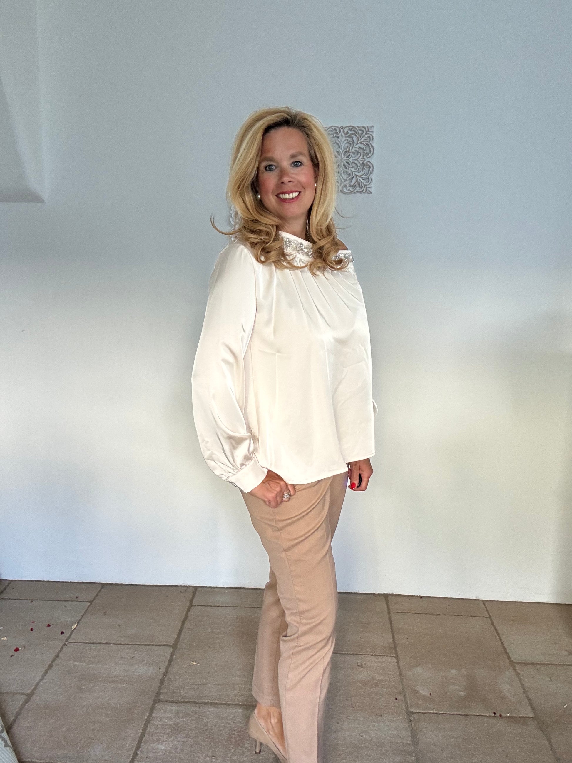 Wunderschöne Bluse aus edlem schweren Satin mit einer auffallenden, edel mit Schmucksteinen versehenen Ausschnittlösung.
