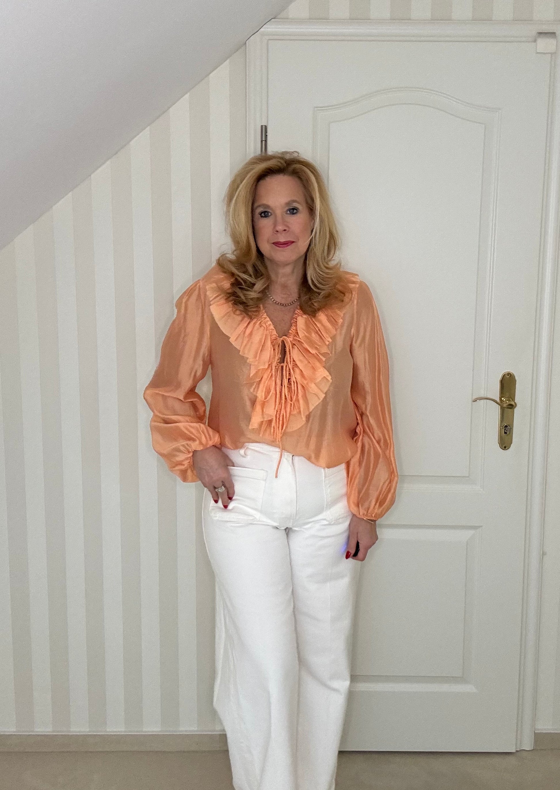 Der Volantkragen ist unversäubert und gibt der Bluse einen besonderen Look.