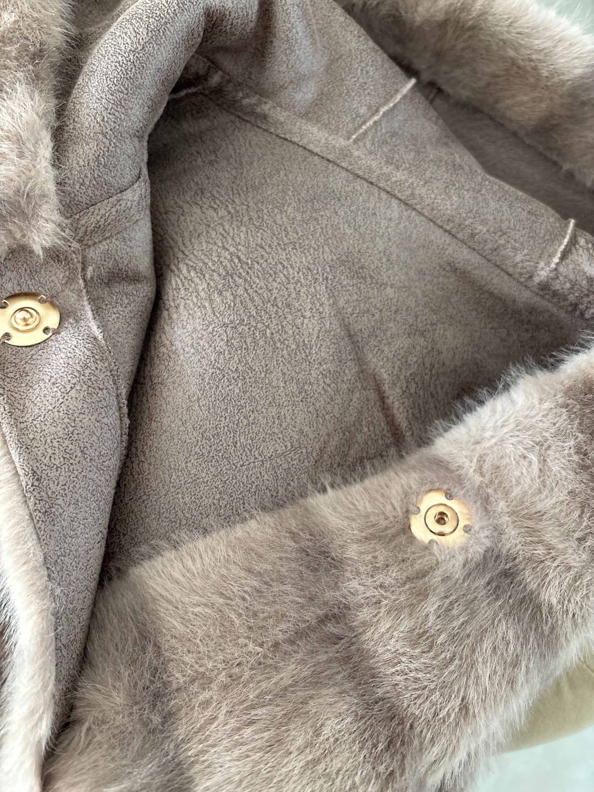 Material: 100% Fakefur (Polyester), Futterabseite: veganes Leder