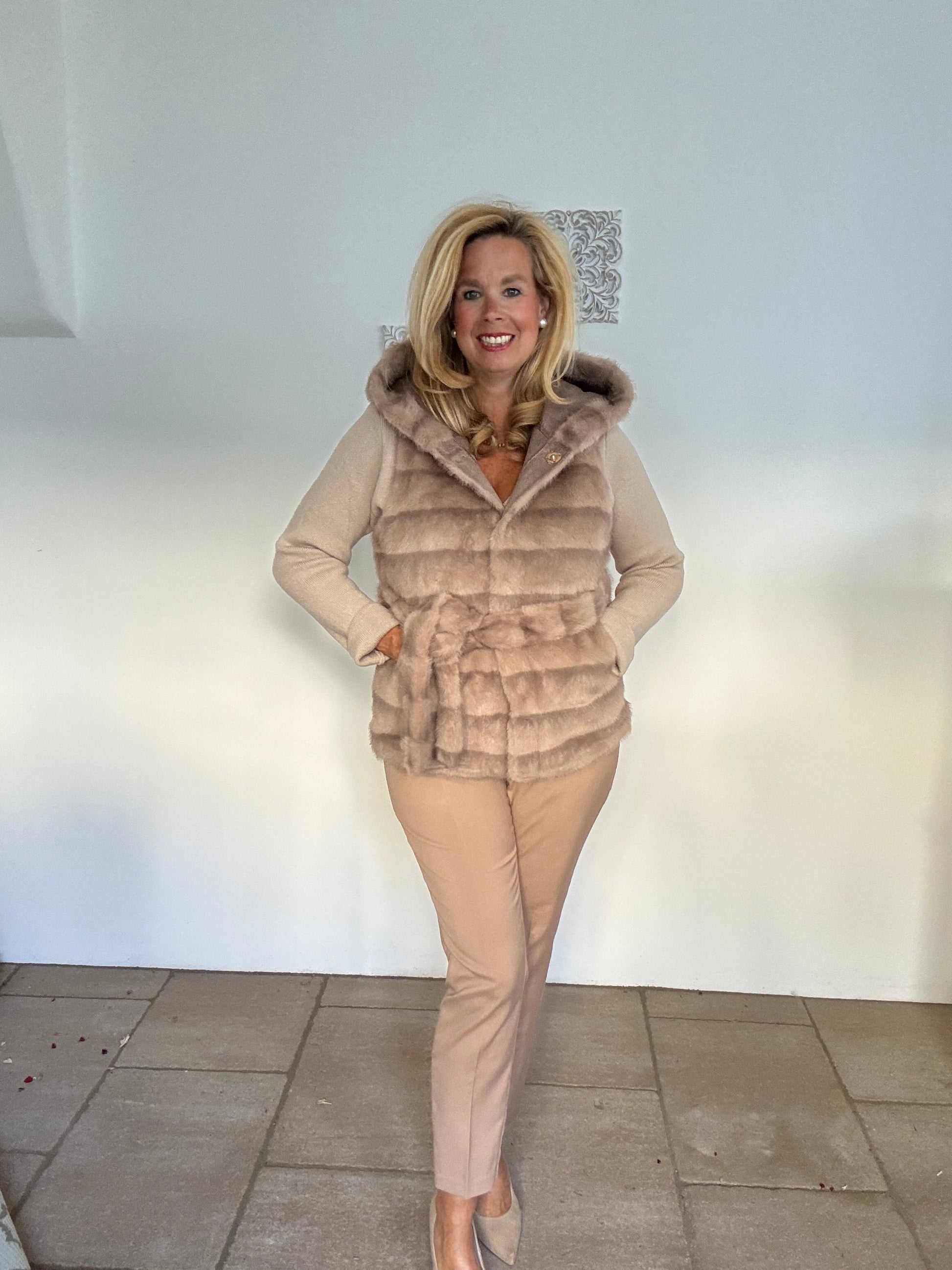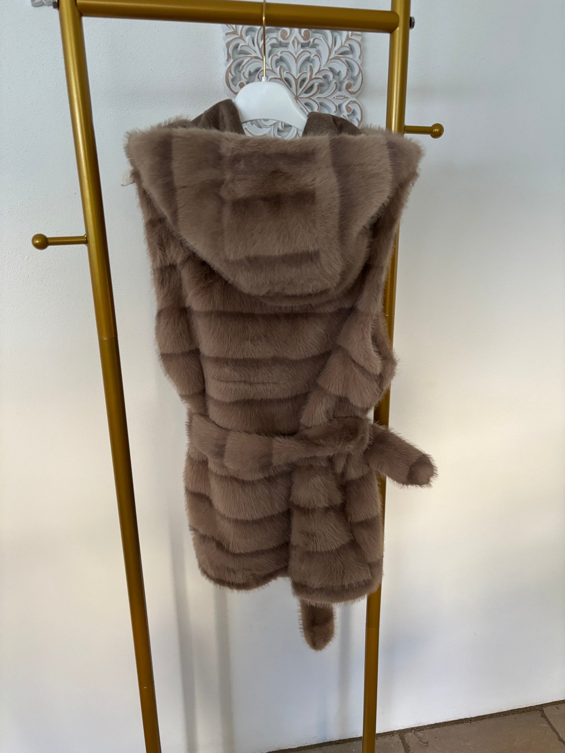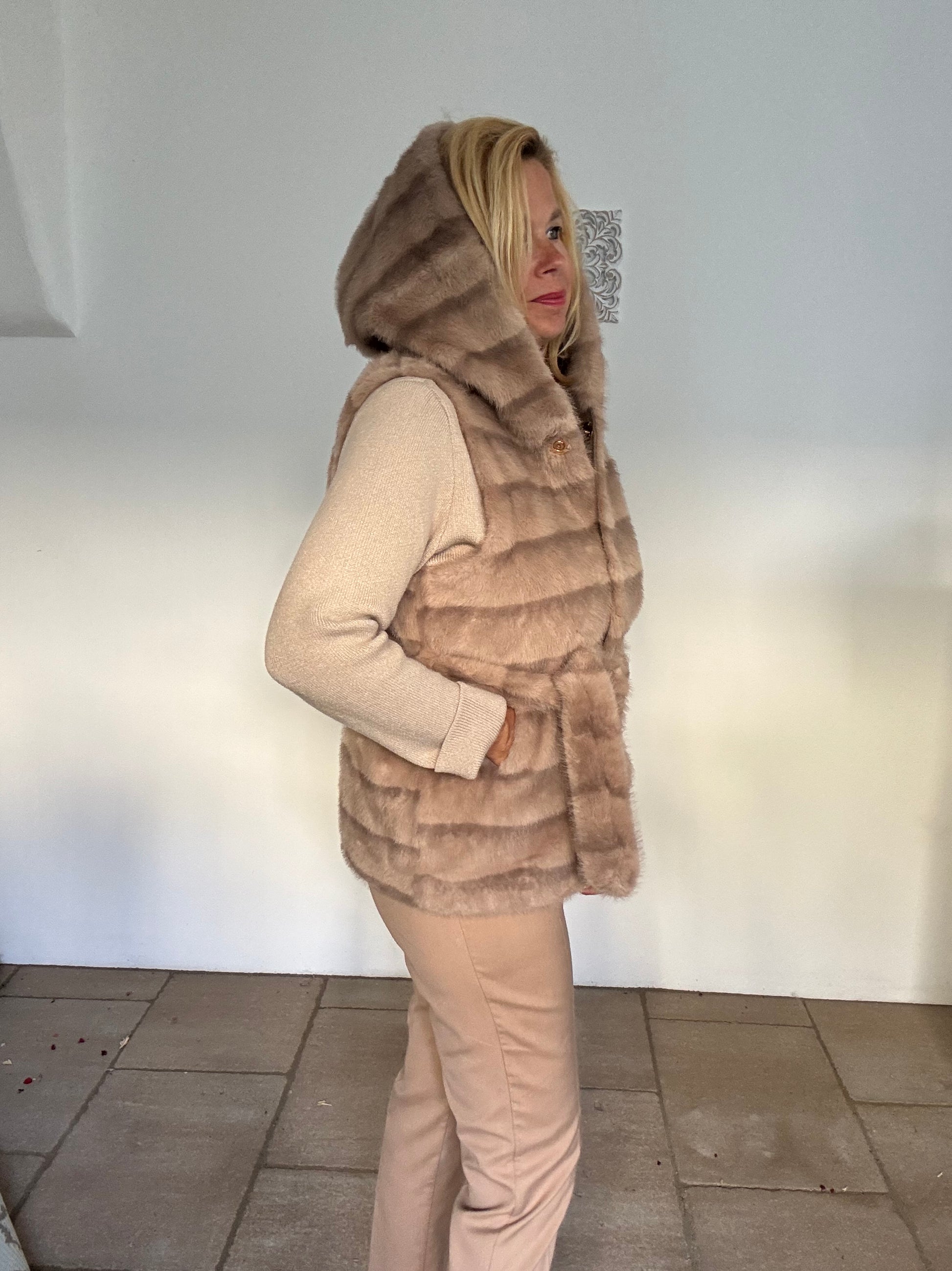 Pelzweste aus täuschend echtem Fakefur mit körpernaher Schnittführung und Kapuze.