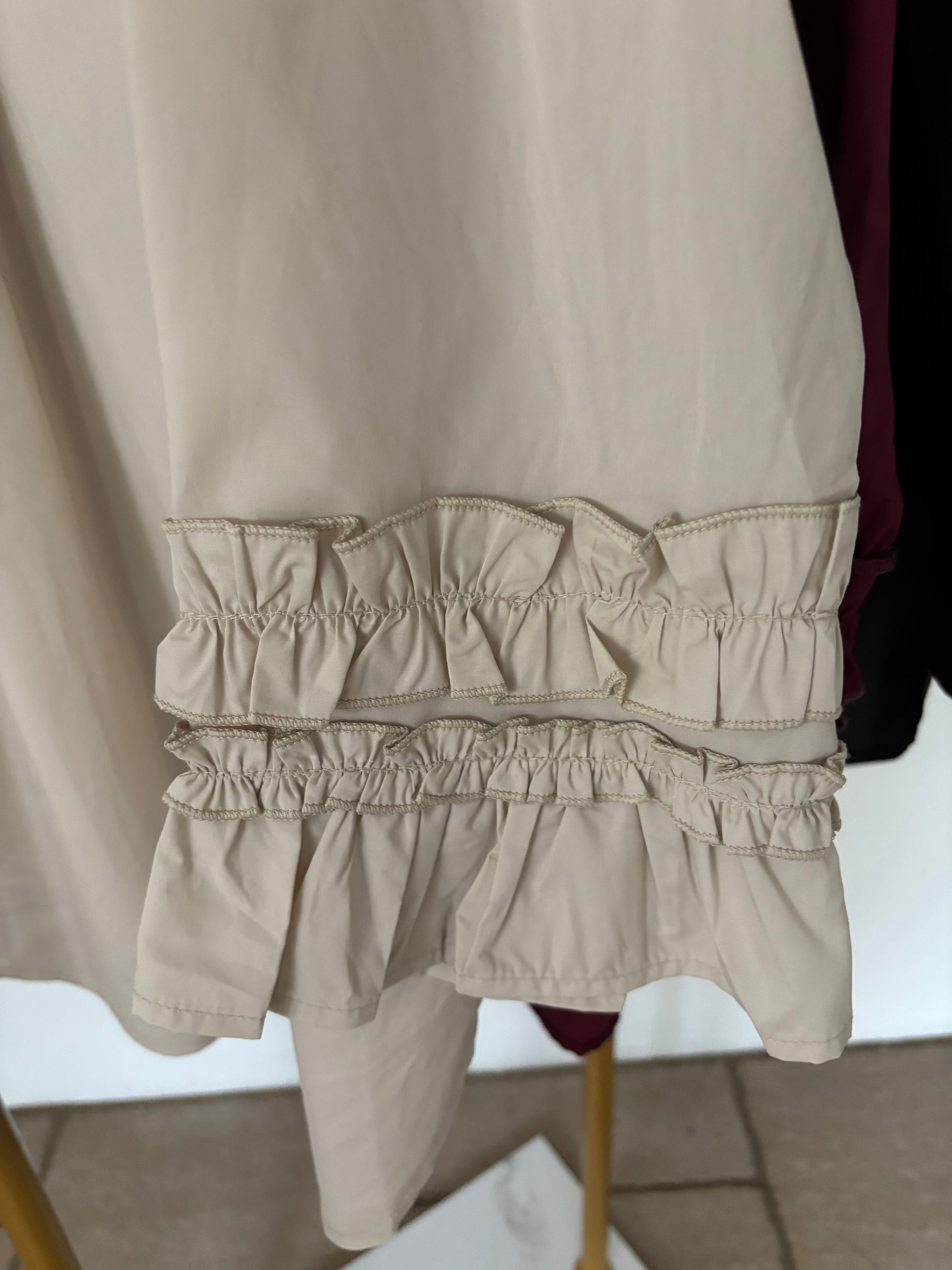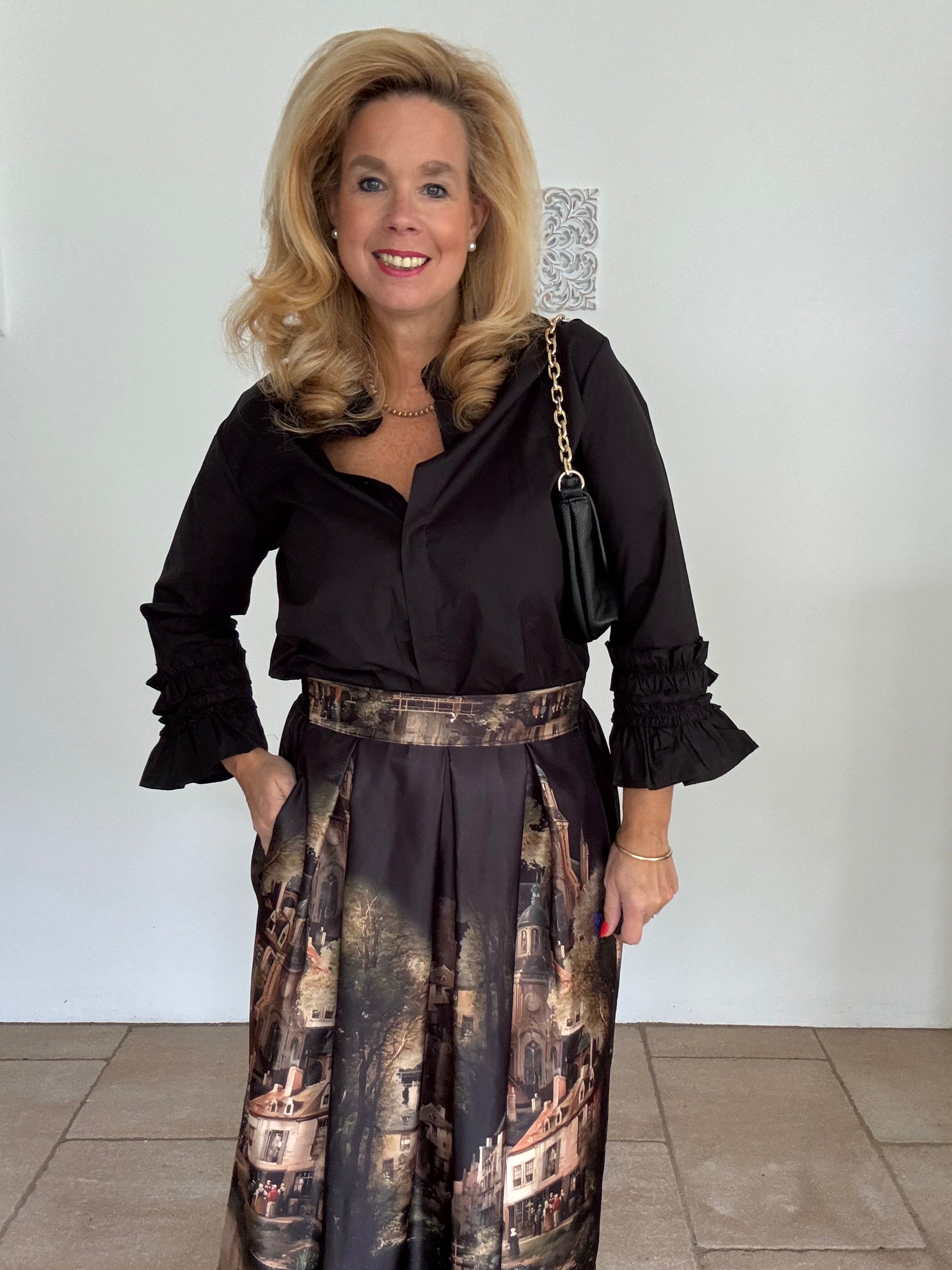Sehr schöne, etwas längere Bluse mit Stehkragen, verdeckter Knopfleiste und aussergewöhnlicher Manschetten.