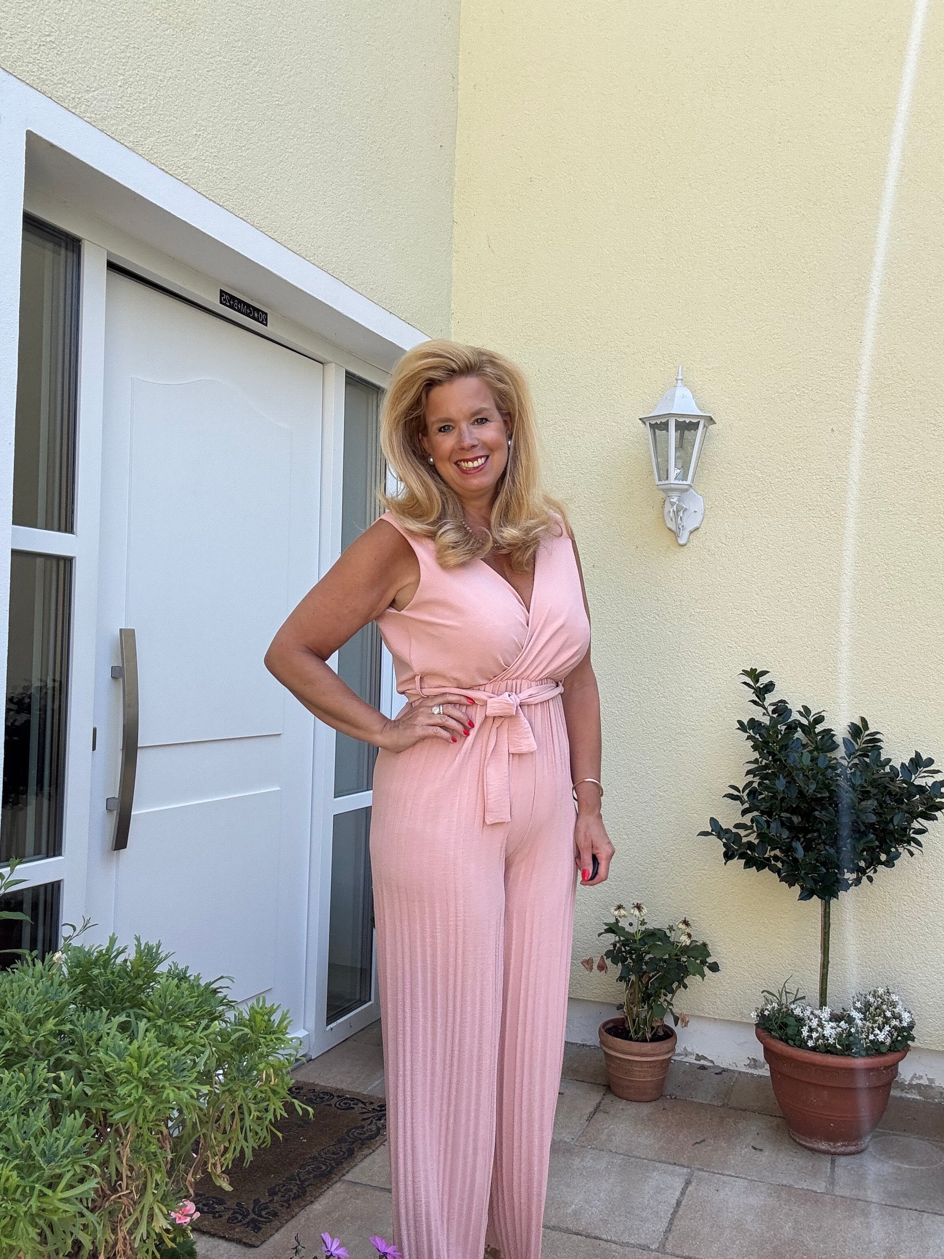 Sehr schöner Jumpsuit mit Wickeloberteil im vorder-sowie im Rückenteil und weiter plisierter Hose.