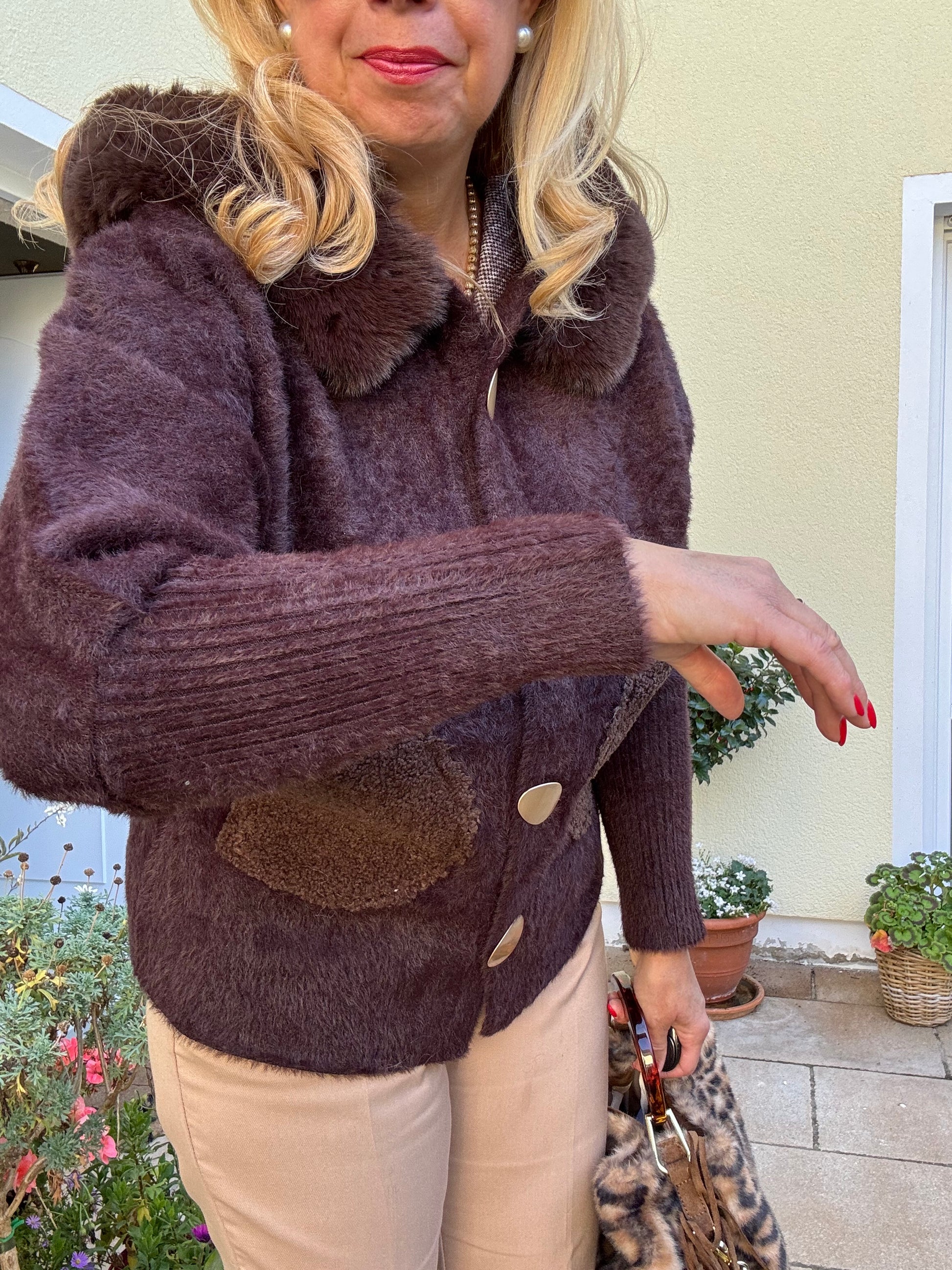 Sehr schöne wärmende Jacke aus glattem Fellstrick mit Kapuze mit dekorativen Pelzbesatz und goldenen Knöpfen zum verschließen der Jacke.