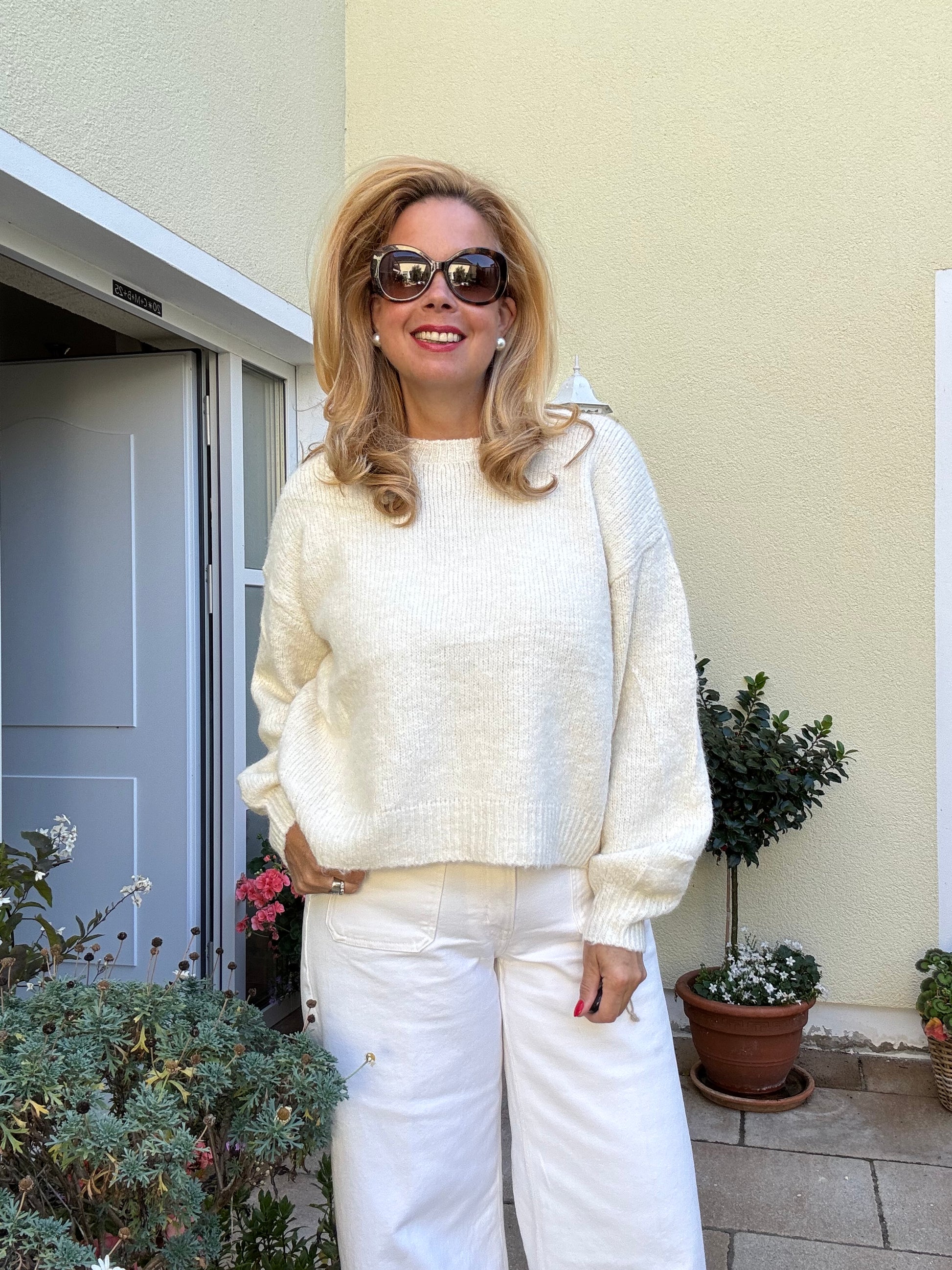 Du kannst den Pulli als Pulli oder Strickjacke tragen.