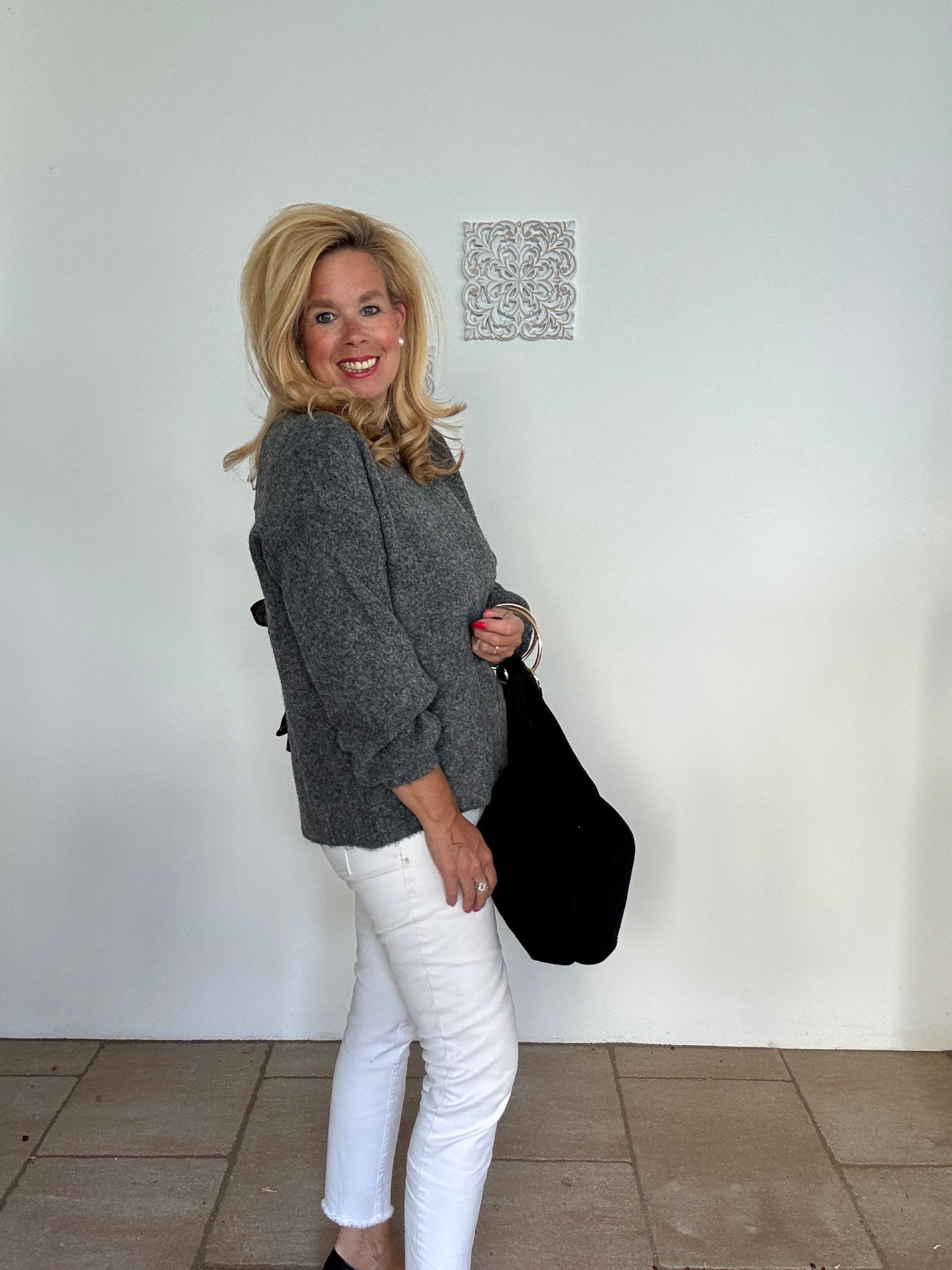 Kuscheliger schlichter Pulli, der im Rückenteil mit drei Schleifen überrascht.
