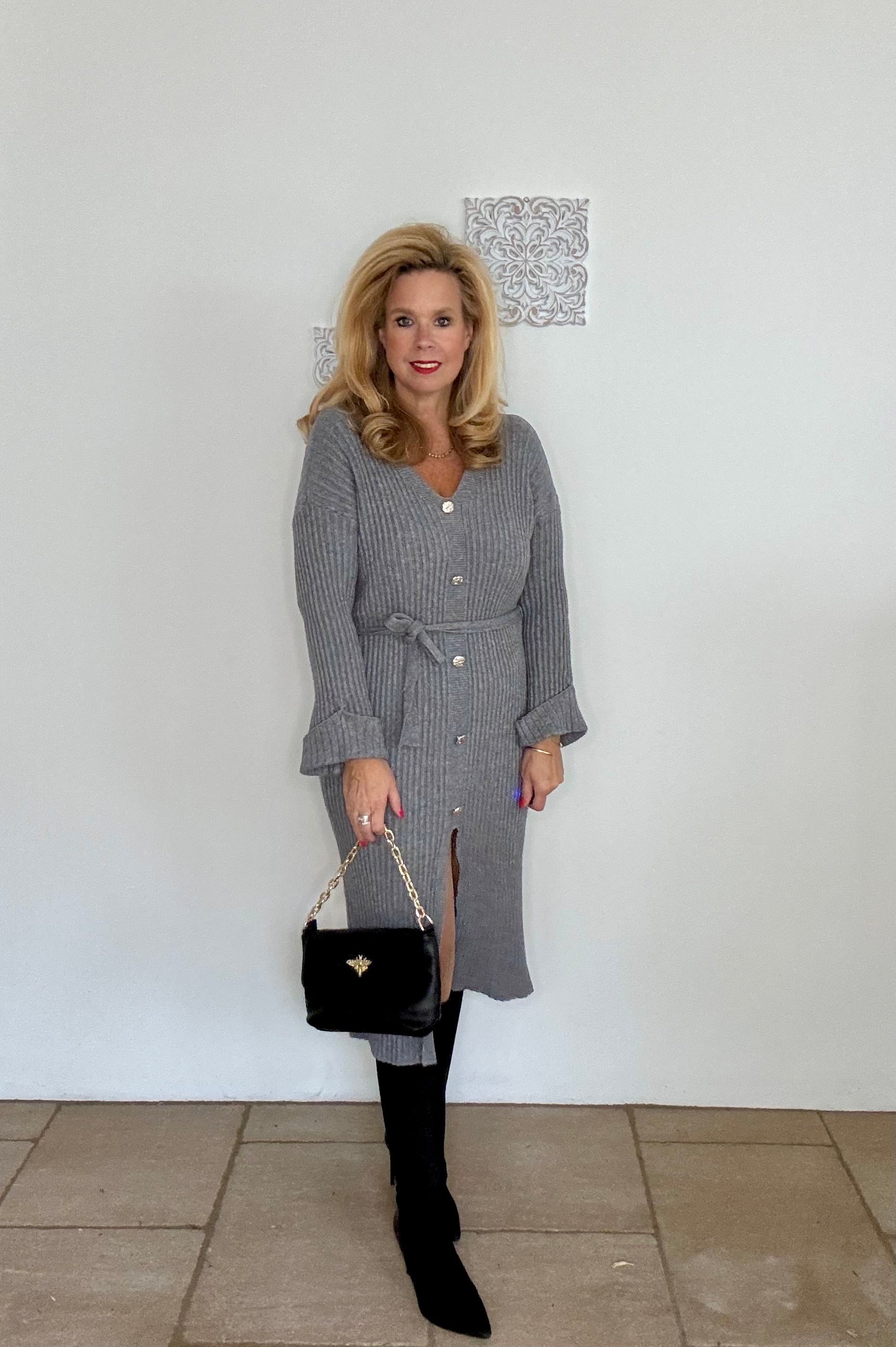 Mitgeliefert wird ein passender schmaler Strickgürtel.