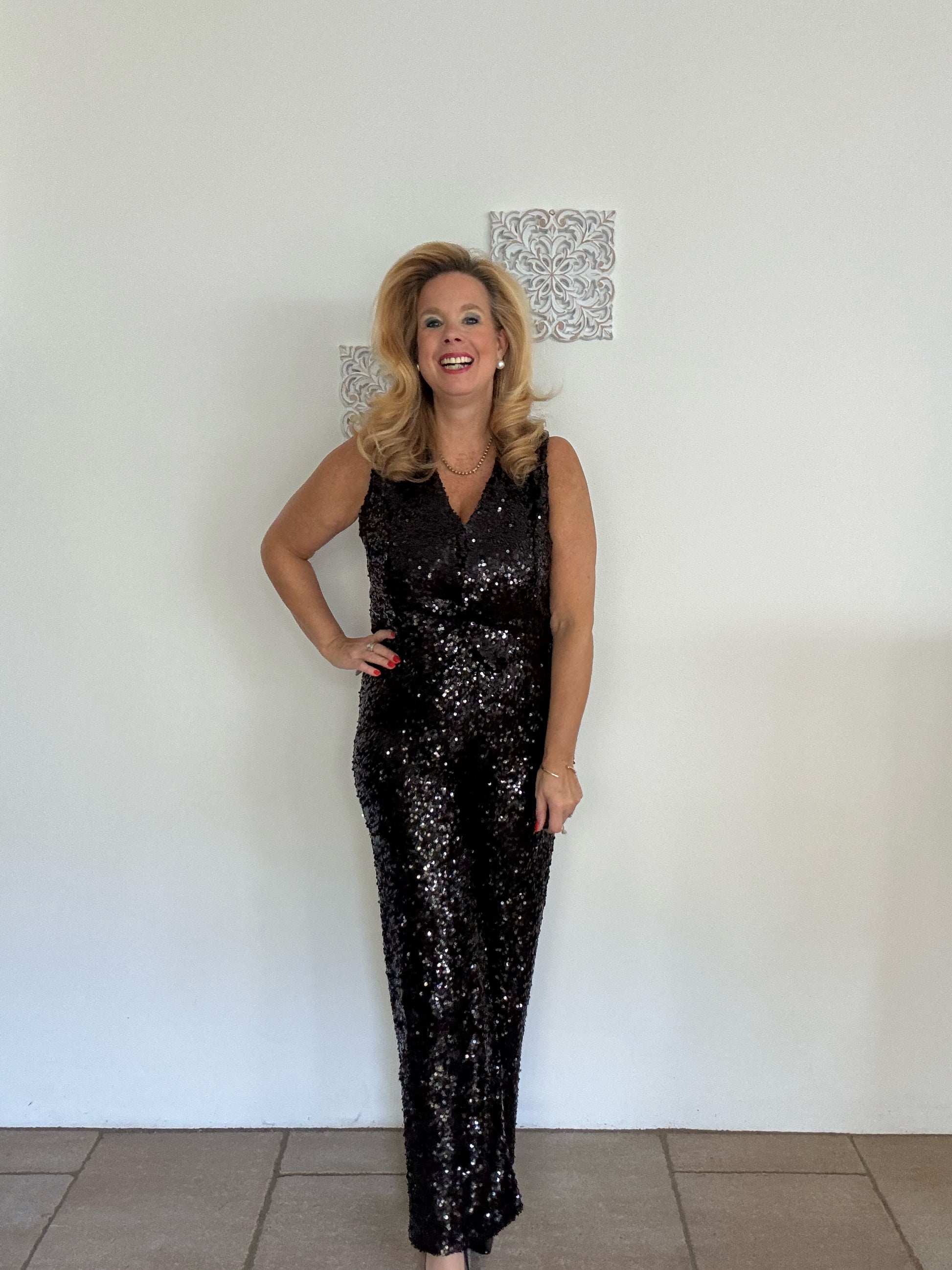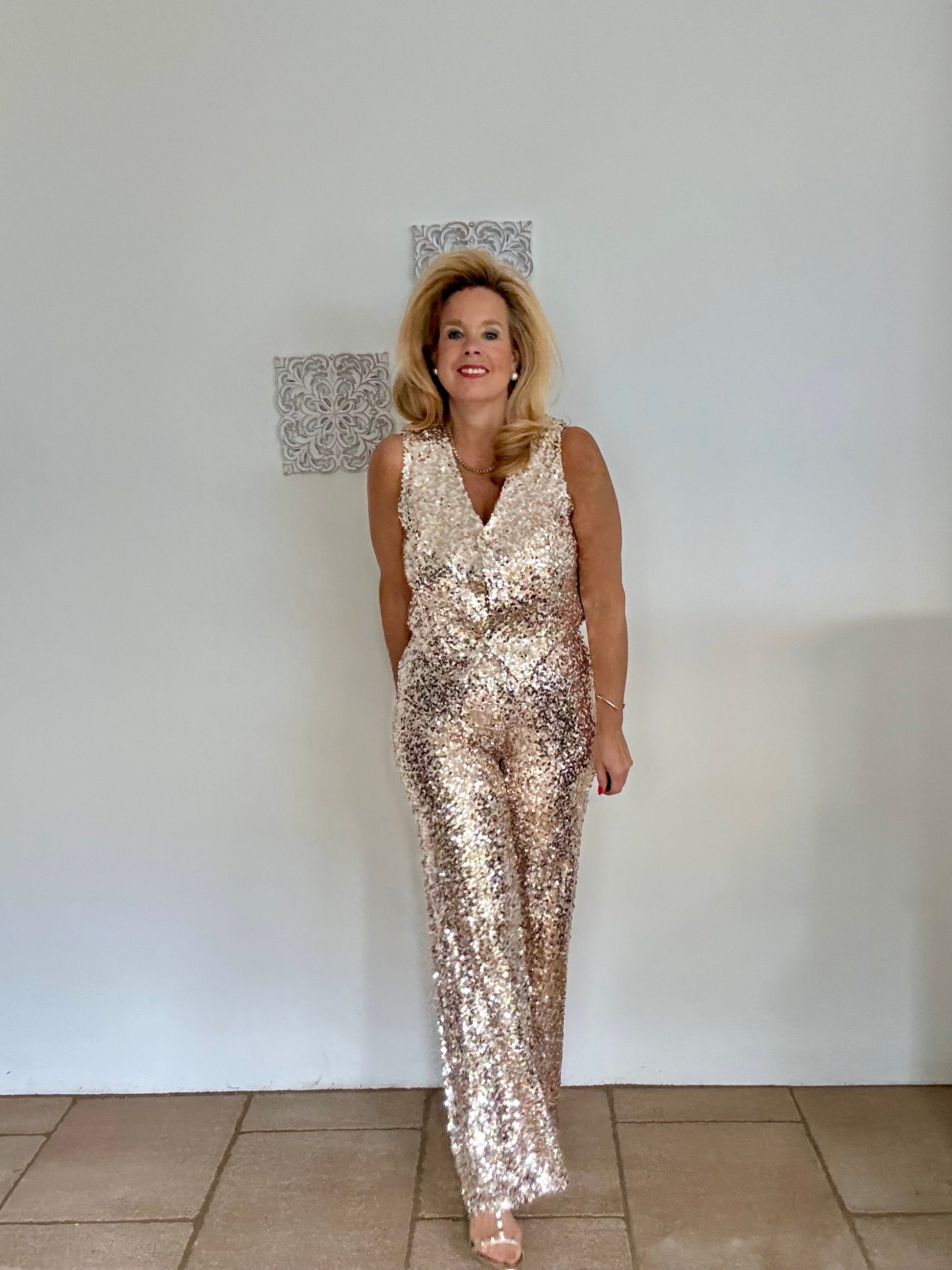 Schöne, kurze Paillettenweste, die die Paillettenhose und den -Blazer zum Anzug kombiniert.