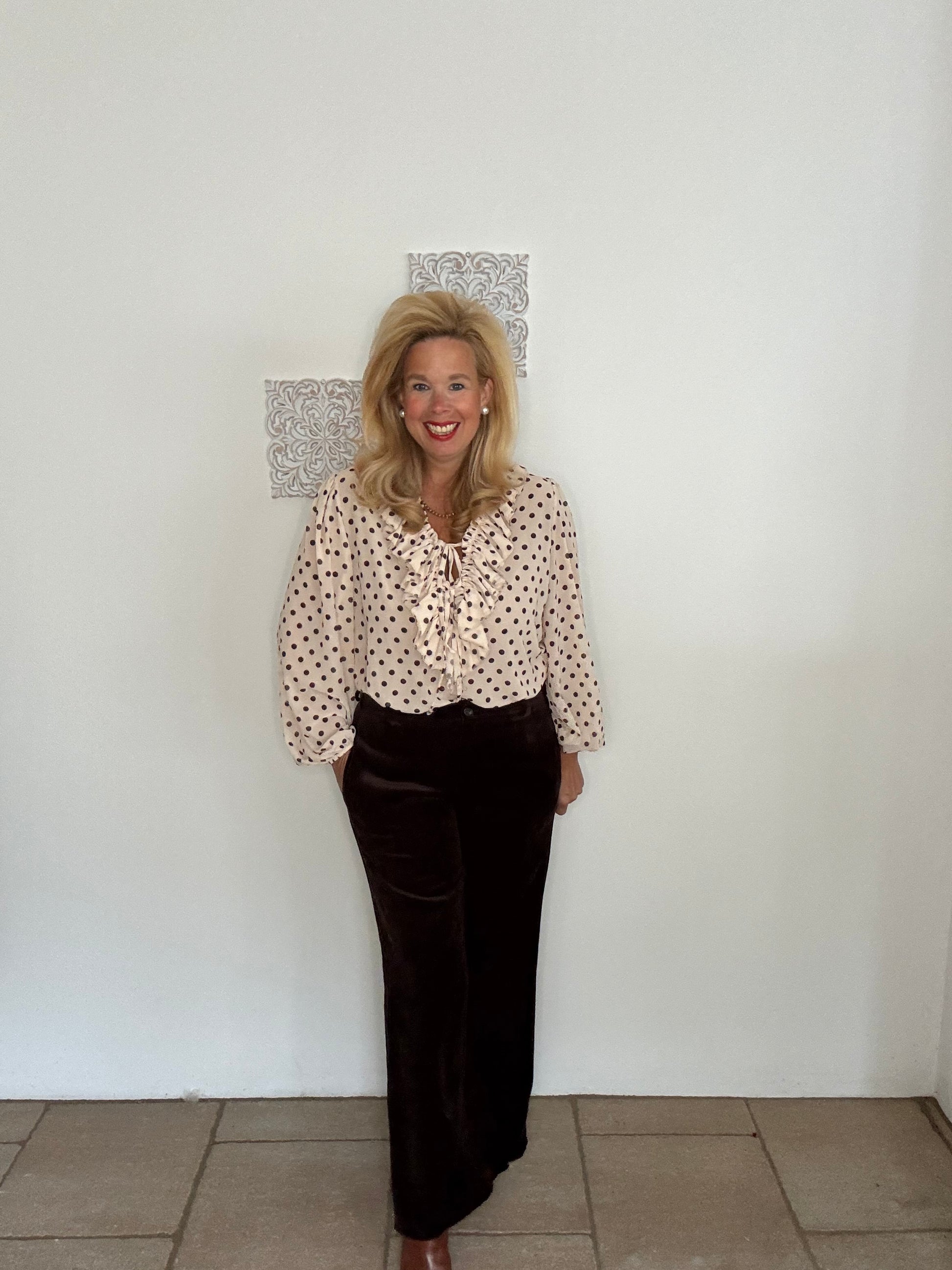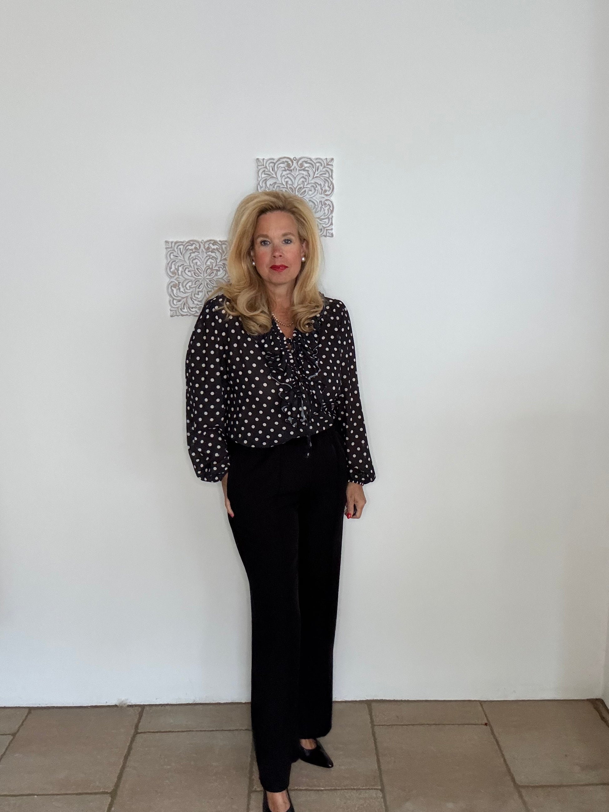 Pünktchenbluse mit 3-fach Volant am Ausschnitt in drei schönen kombifreundlichen Farben.