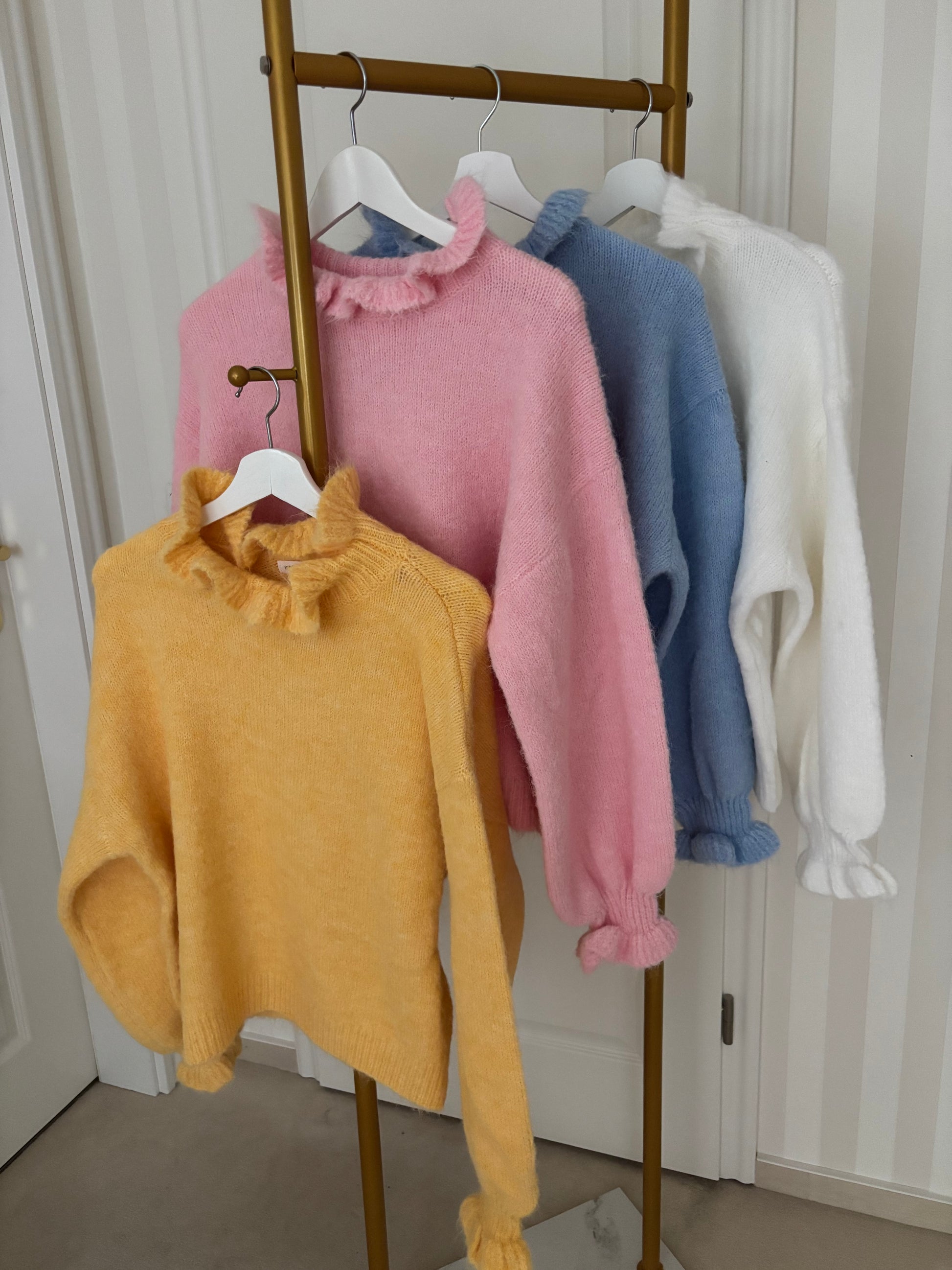 Kuschelweicher Pulli, wunderbar verziert mit Tüschen am Hals und den Ärmelbündchen.