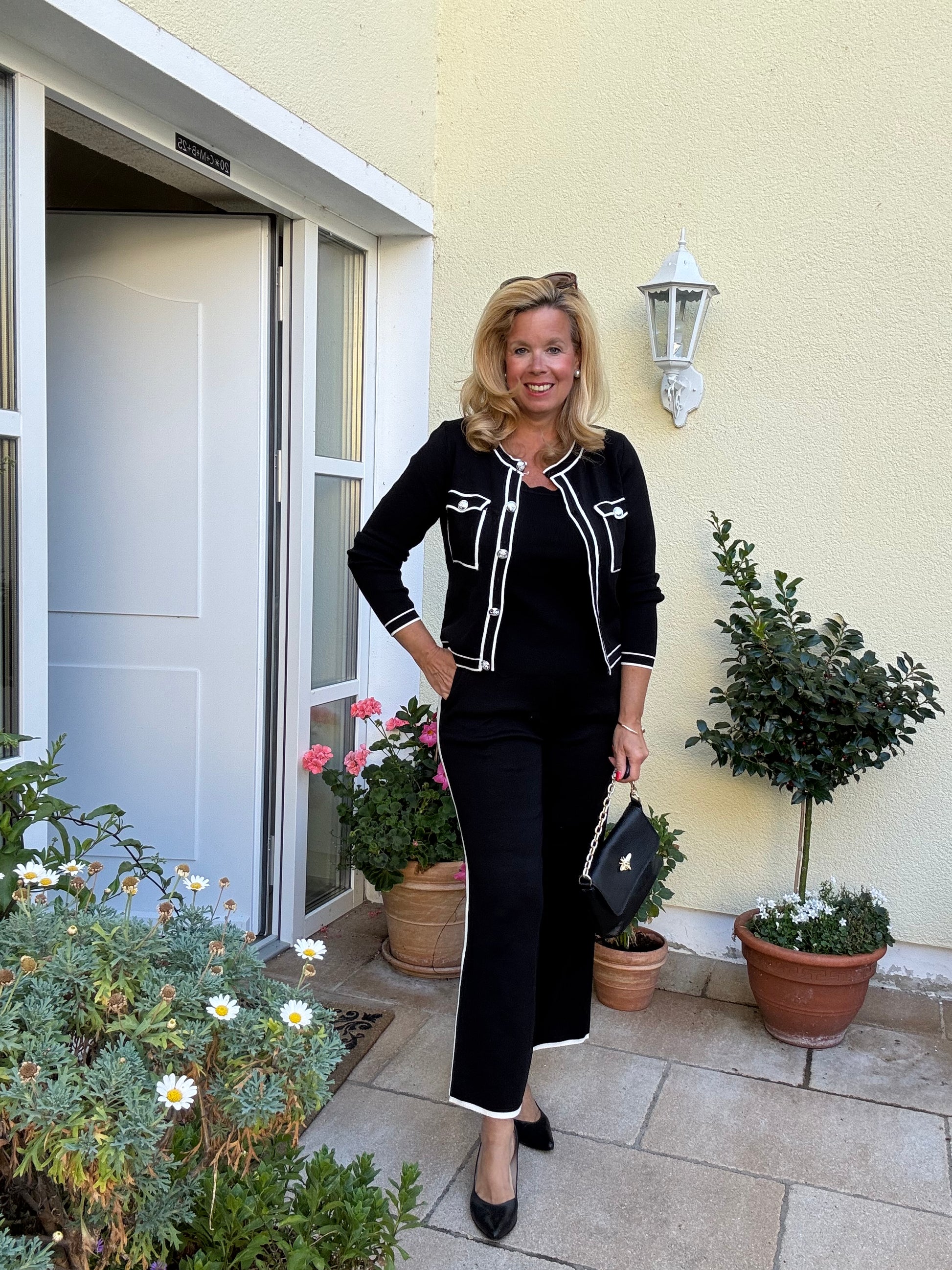 Strickzweiteiler im coutourigen Stil, bestehend aus einer kurzen Jacke mit abgesetzten Blenden, sowie einer sehr bequemen Strickhose mit eingesetzten Gallonstreifen an den Seiten.
