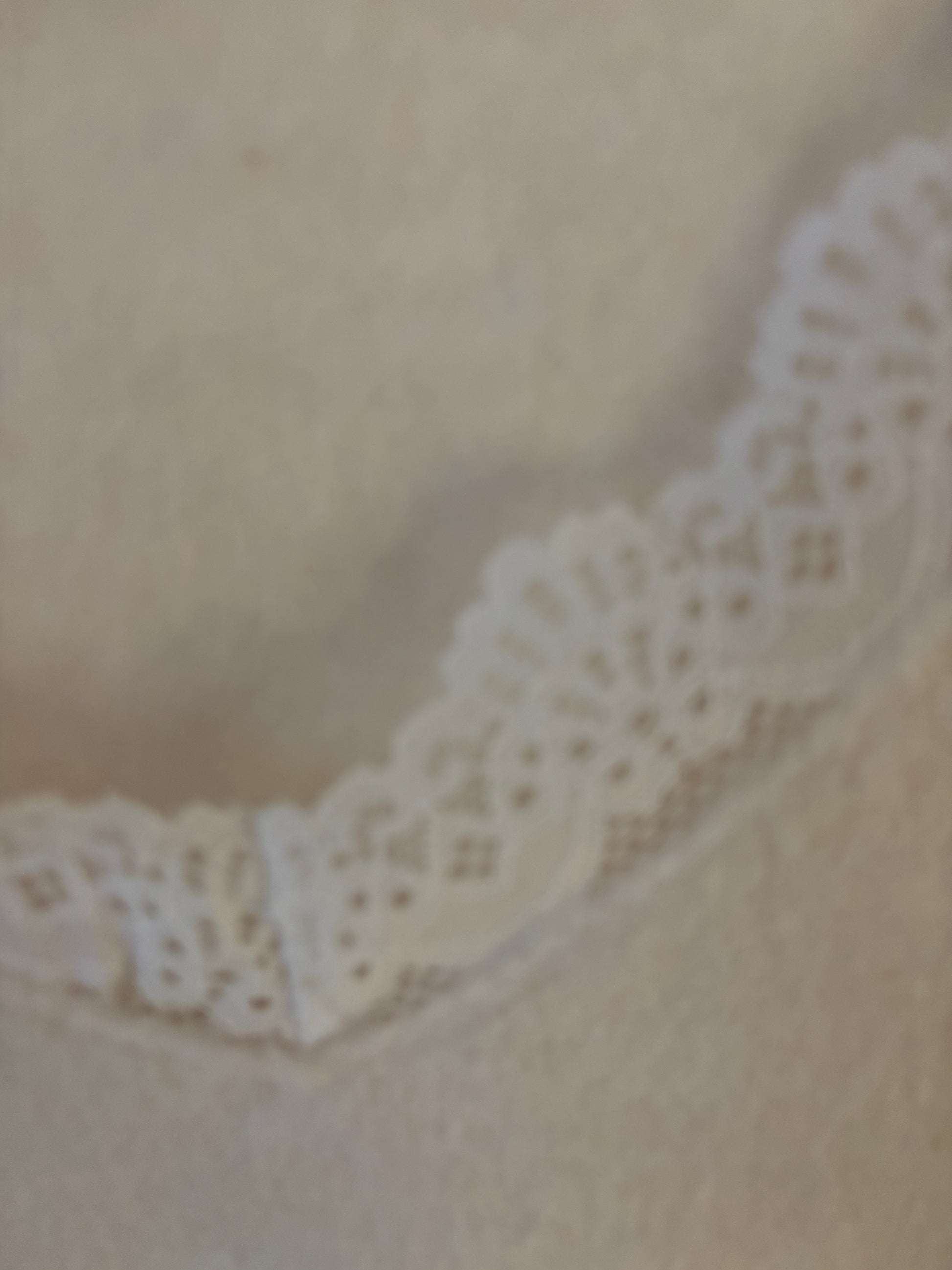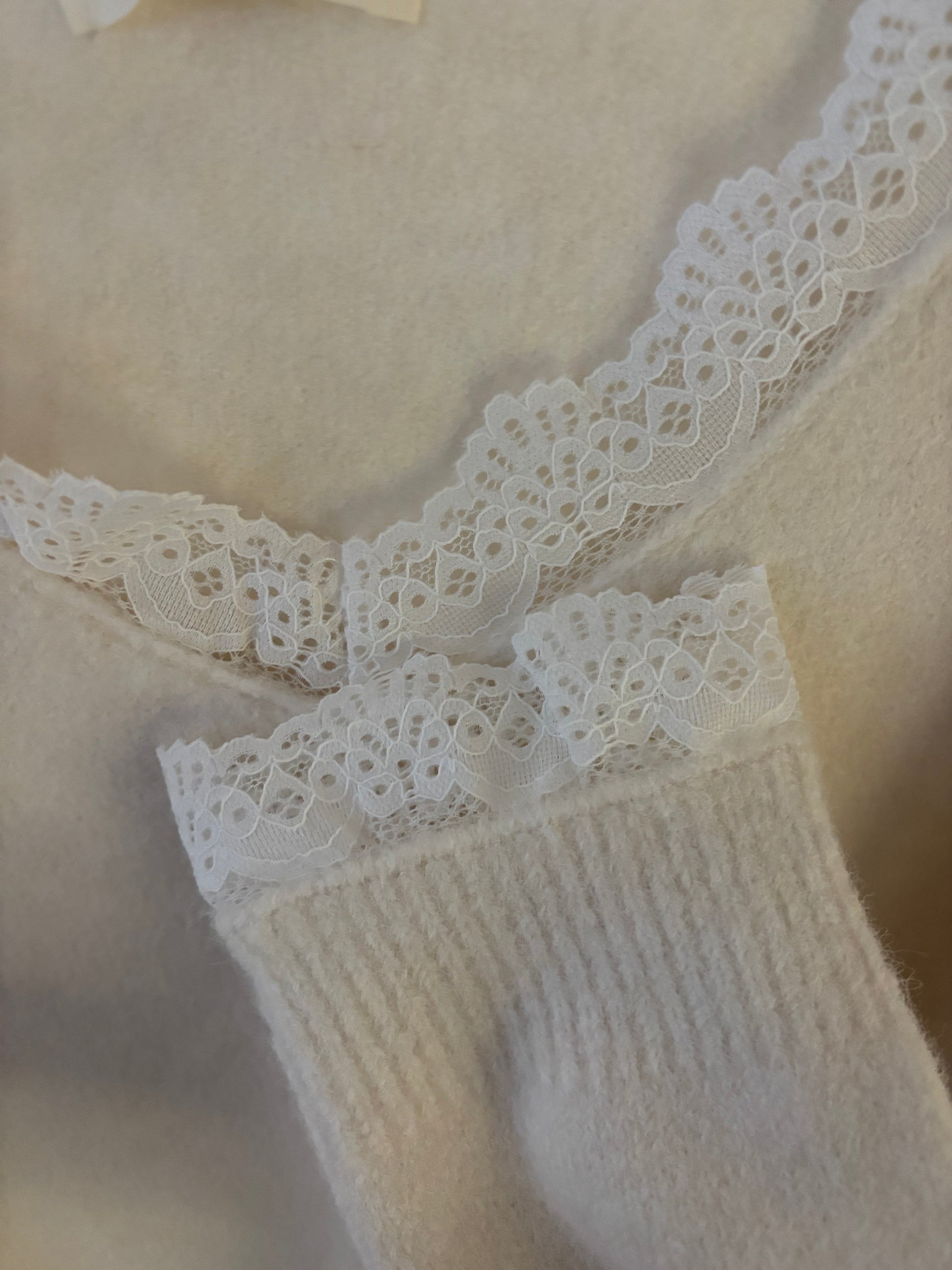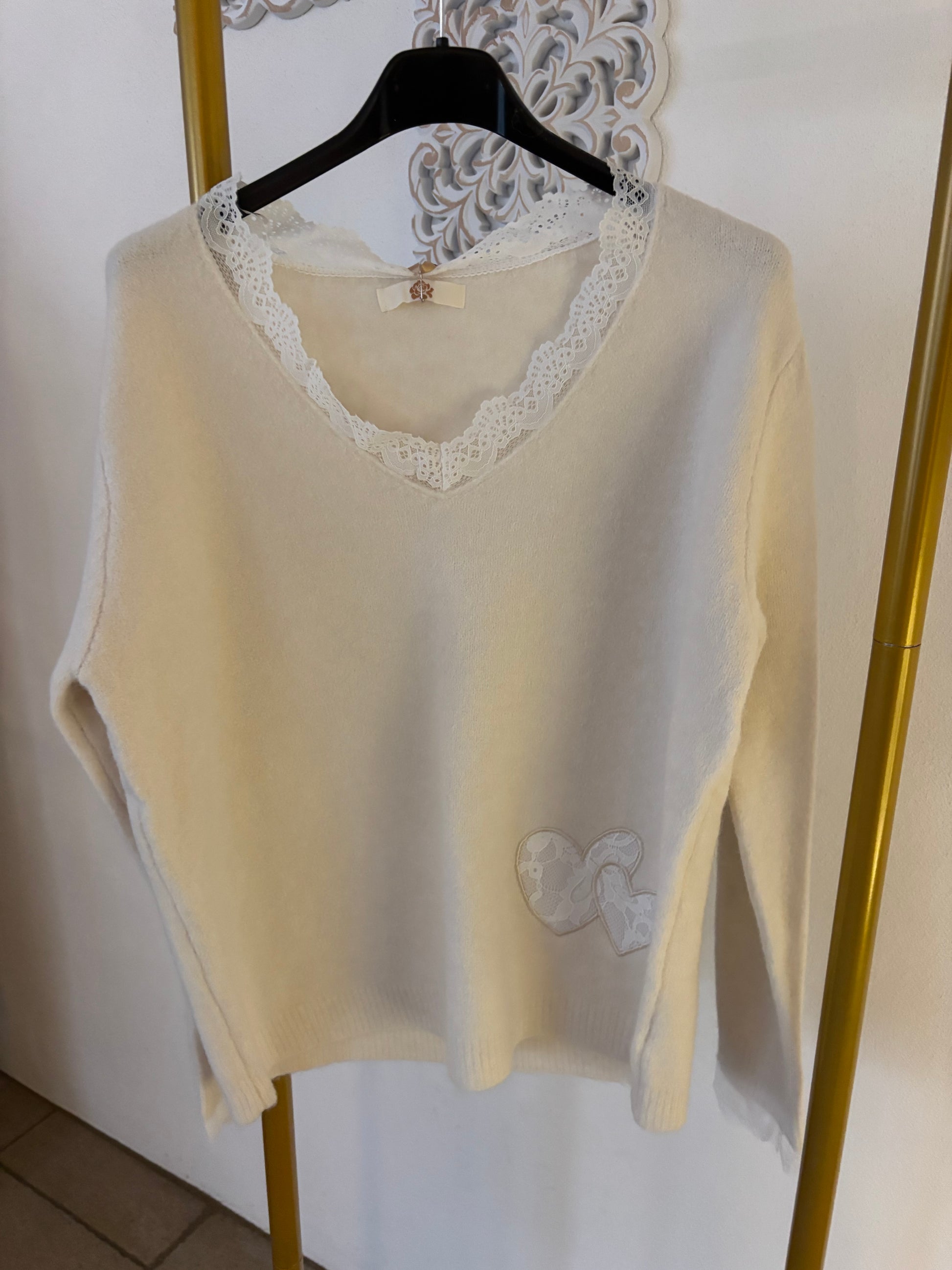 Weicher Pulli mit V-Ausschnitt und Herzapplikation aus zarter Spitze. Ausschnitt und Ärmelbündchen sind mit einer zarten Spitzenborte verziehrt.
