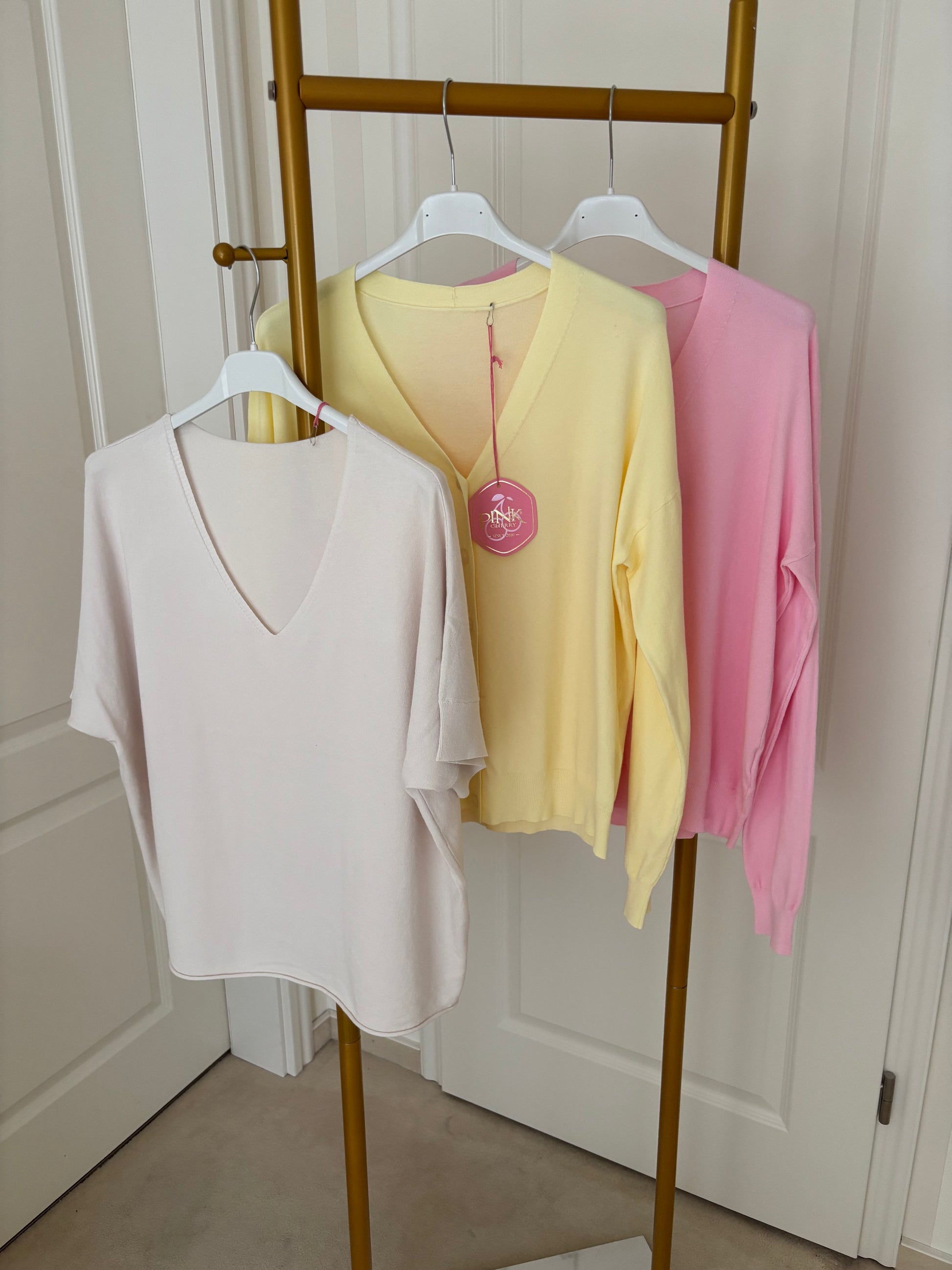 Zarte Feinstrickjacke in zartgelb und Rosé. Perfekte Begleiter zu unserem Statementrock Bella Italia.